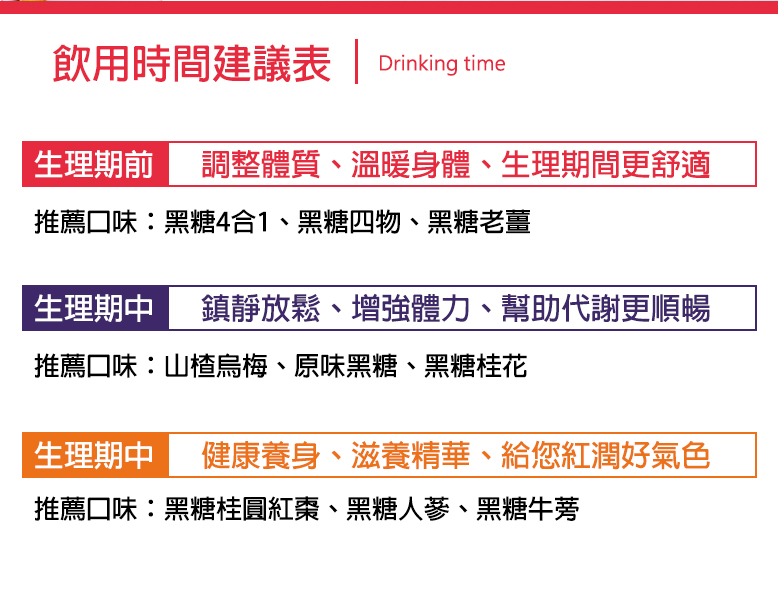 - A:可以的,黑糖促進新陳代謝,調養女性生理期的不適,非常適合女孩們飲用。